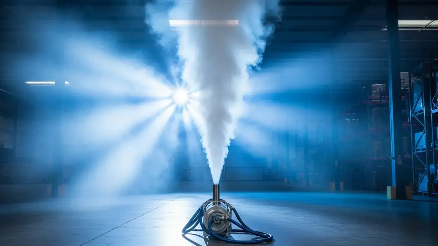 ULV (ultra-low volume) fogging uses a machine to atomise liquid disinfectant into a very fine mist with droplet sizes of 5 to 50 microns. The mist stays airborne long enough to contact all exposed surfaces, including ceilings, walls, and the underside of equipment. It provides comprehensive coverage that manual cleaning cannot achieve.