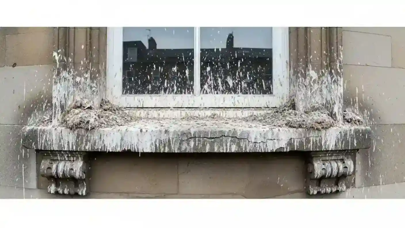 Bird guano is highly acidic (pH 3 to 4.5) due to the uric acid content. Over time, it causes significant damage to building surfaces including stonework and masonry (erosion, pitting, and staining), concrete (surface degradation and rebar corrosion in severe cases), metal roofing and cladding (corrosion and paint failure), painted surfaces (blistering, discolouration, and paint stripping), timber (staining and surface degradation), and vehicle paintwork (etching and permanent staining).